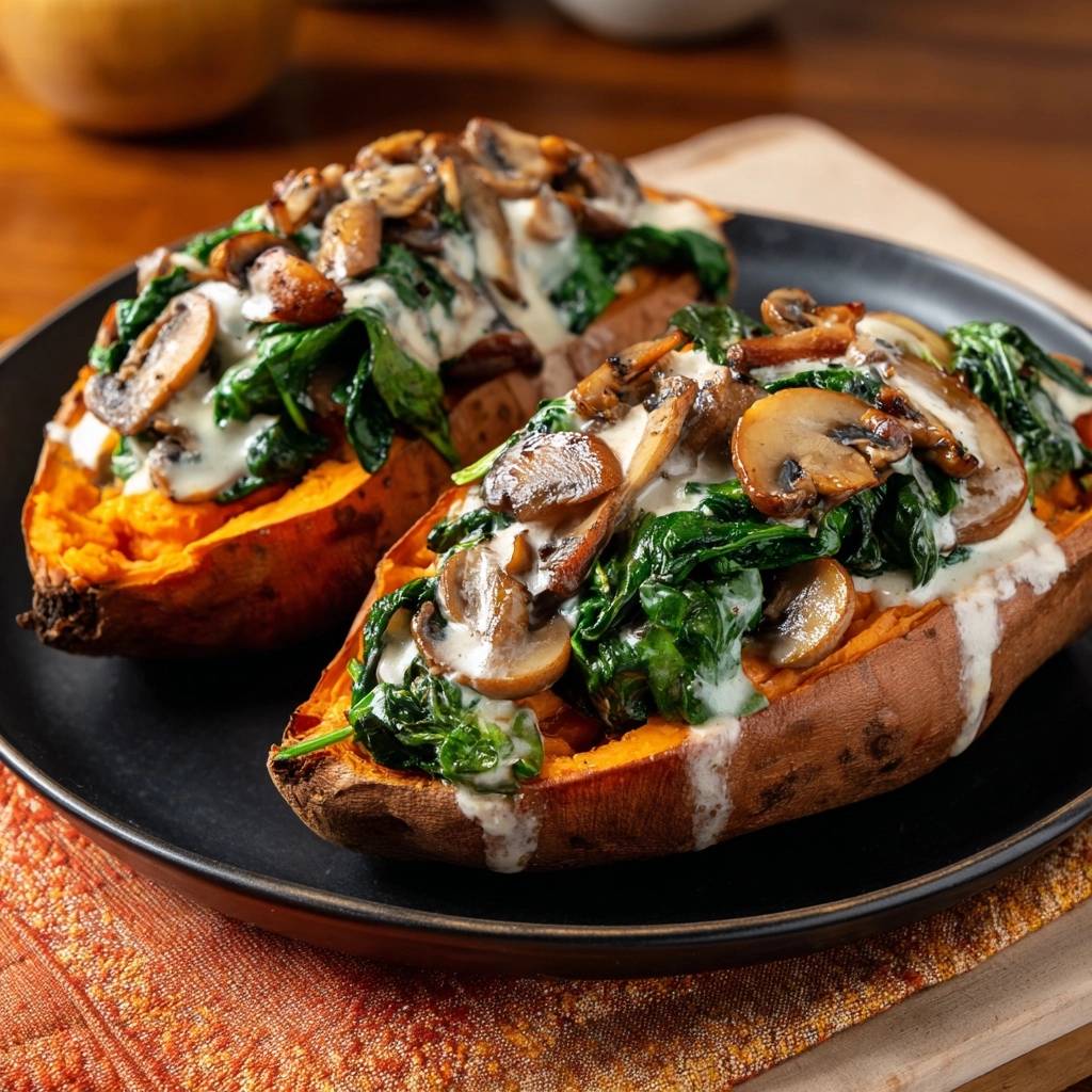 Cremig gefüllte Süßkartoffeln mit Spinat & Pilzen