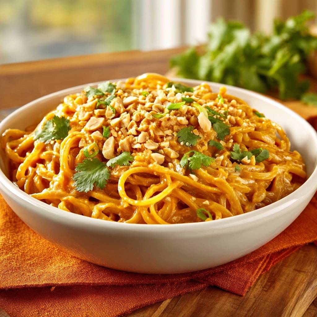 Stell dir vor, du beißt in diese cremigen Erdnussnudeln rein. Die Soße glänzt orange, umhüllt jede Nudel seidig und knackt dann mit gerösteten Erdnüssen. Der Duft von Ingwer, Knoblauch und Limette steigt auf, während Koriander frisch knistert. Ein Bissen, und du bist hooked – süß, würzig, cremig pur.