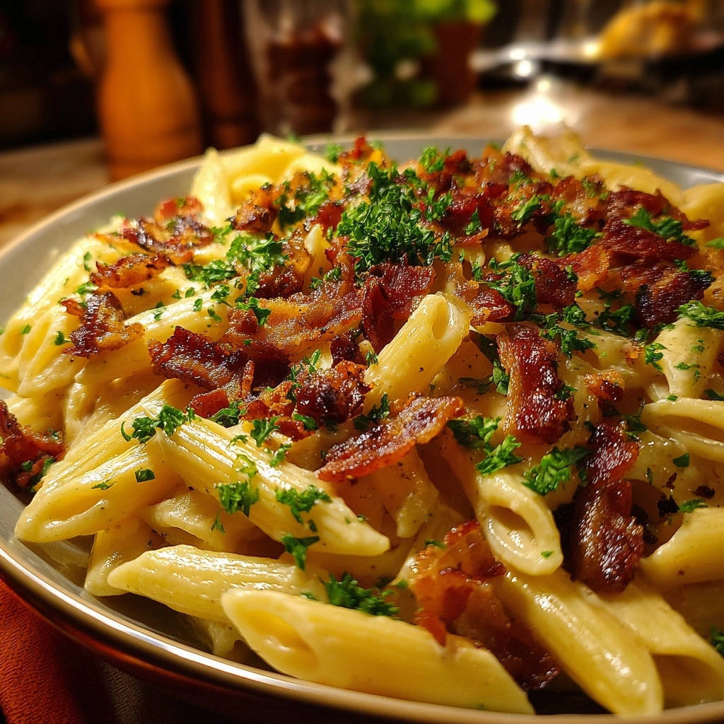 - Anrichten und genießen: Die cremige Penne sofort auf Tellern anrichten. Großzügig mit dem perfekt splitterkrossen Bacon bestreuen und zum Schluss mit frischer gehackter Petersilie garnieren. Sofort servieren und jeden Bissen der unwiderstehlich cremigen Pasta mit dem knusprigen Bacon genießen!