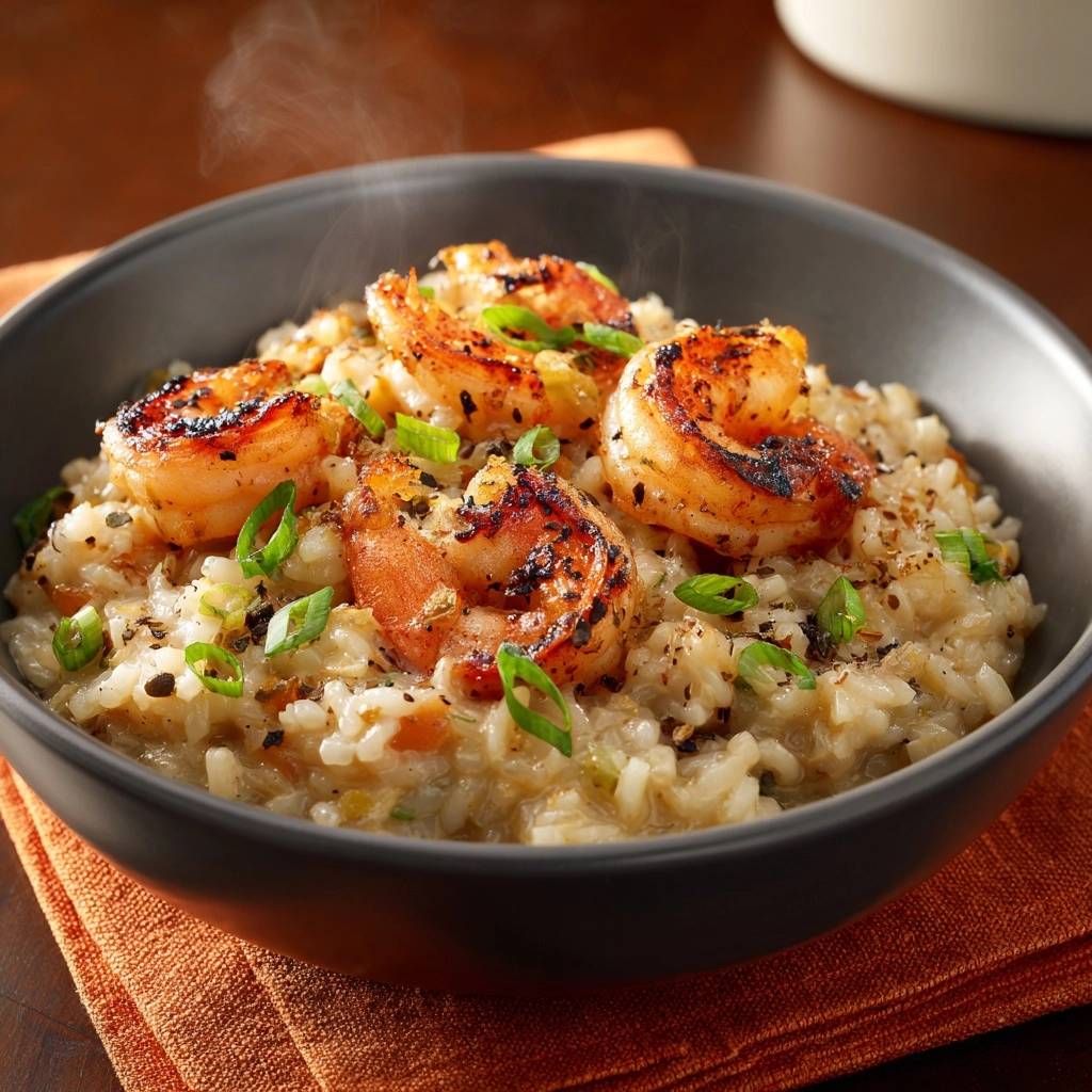 Stell dir vor, du nimmst die erste Gabel dieses cremigen Garnelenrisottos in den Mund. Der Reis schmilzt weich und samtig auf der Zunge, umhüllt von einer reichen, buttrigen Creme. Dann knackt die goldene Kruste der Garnelen durch, saftig und voller Meeresaroma.