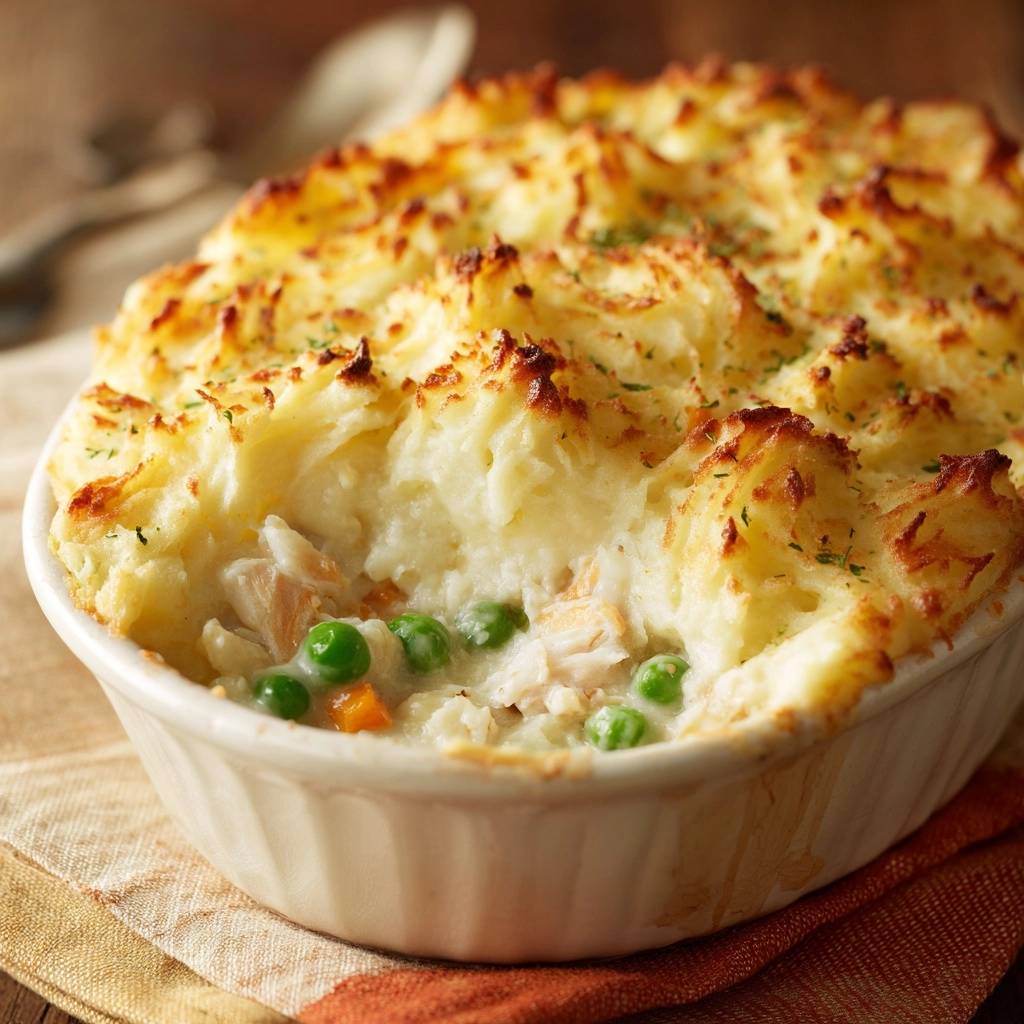 Cremiger Hähnchen-Erbsen-Auflauf mit Kartoffelkruste