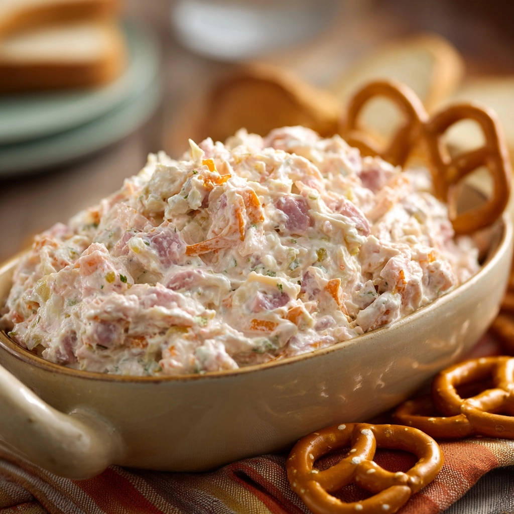 Servieren Sie den gut gekühlten Cremigen Schinken-Karotten-Dip. Er schmeckt hervorragend zu frischen Brezeln, knusprigem Brot oder Ihren Lieblings-Crackern.