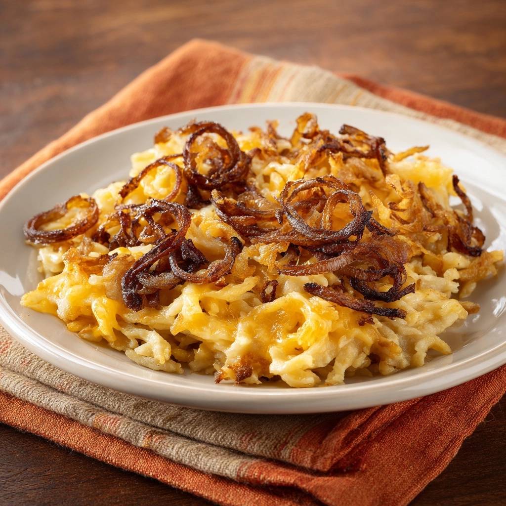 Stell dir vor, du nimmst die erste Gabel von diesem cremigen Käse-Kartoffel-Püree mit knusprigen Zwiebeln. Der Käse schmilzt auf der Zunge, die Kartoffeln sind samtweich, und oben drauf knacken diese goldgelben Zwiebelringe so herrlich.