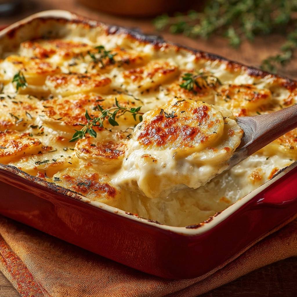 Stell dir vor, du schaufelst die erste Gabel cremiges Kartoffelgratin in den Mund. Die Kruste knackt leicht, darunter schmilzt pure Seide aus Kartoffel und Käse. Der Thymian duftet herb, die Sahne umhüllt alles weich.