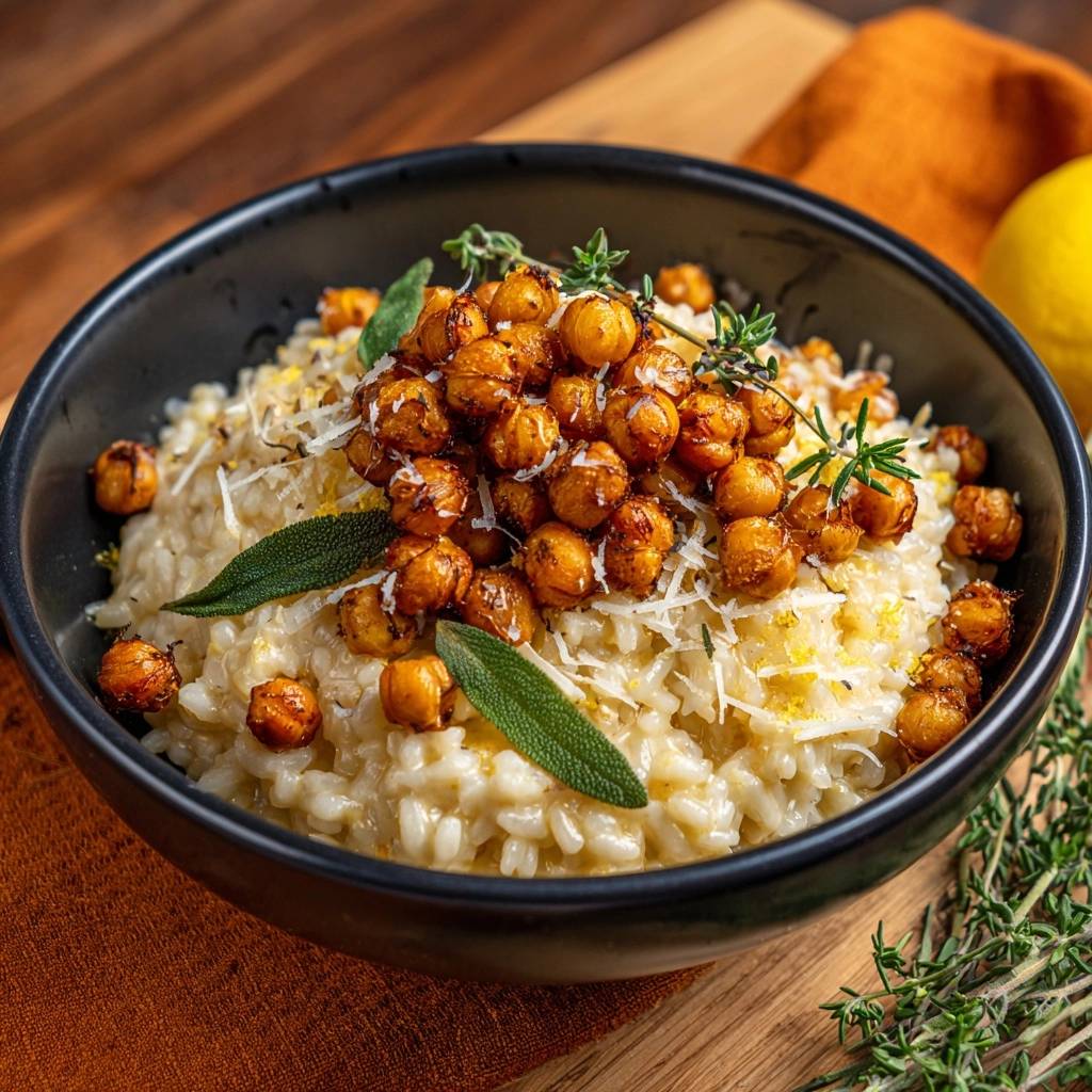 Der Duft von frischer Zitrone mischt sich mit dem cremigen Risotto, und dann knackst der erste Biss in die goldbraunen Kichererbsen. Das ist pure Freude am Teller. Du spürst die cremige Textur, die durch den Zitronenabrieb hell und sommerlich wird.