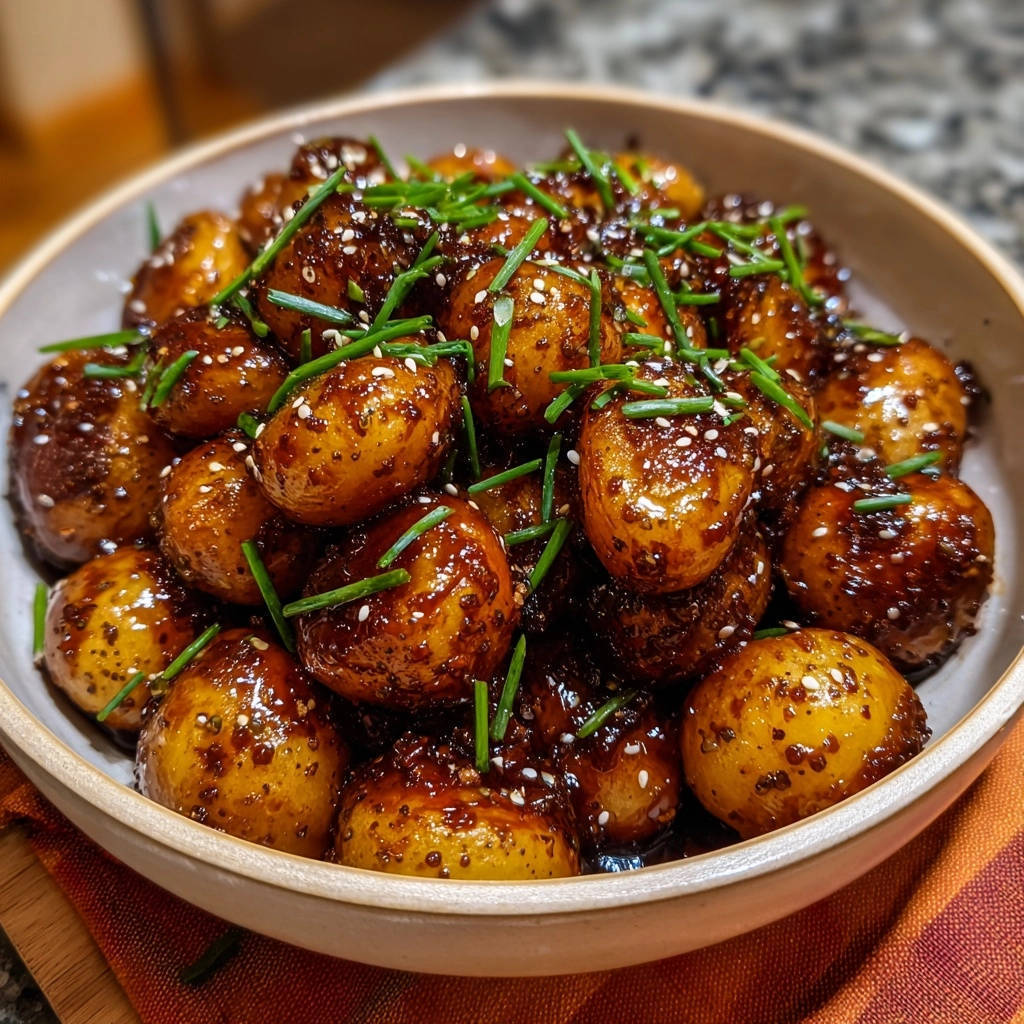 - Die glasierten Babykartoffeln in eine Servierschüssel füllen. Mit gerösteten Sesamsamen und frischem Schnittlauch garnieren. Sofort servieren und diesen unwiderstehlichen Genuss erleben!
