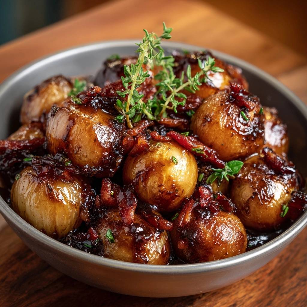 Der erste Bissen knistert leicht, dann explodiert der Geschmack: süß-karamellige Perlzwiebeln, bissfest und glänzend, umhüllt von knusprigem Speck und dem herben Duft frischen Thymians. Du spürst die Textur sofort, knackig innen, nirgends matschig. Das ist der Moment, wo Beilagen zur Hauptattraktion werden.