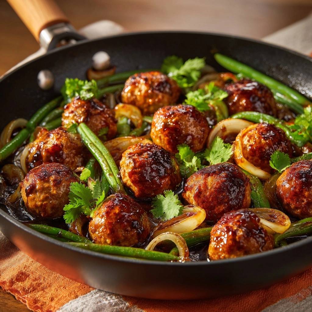 Glasierte Rindfleisch-Bällchen mit grünen Bohnen