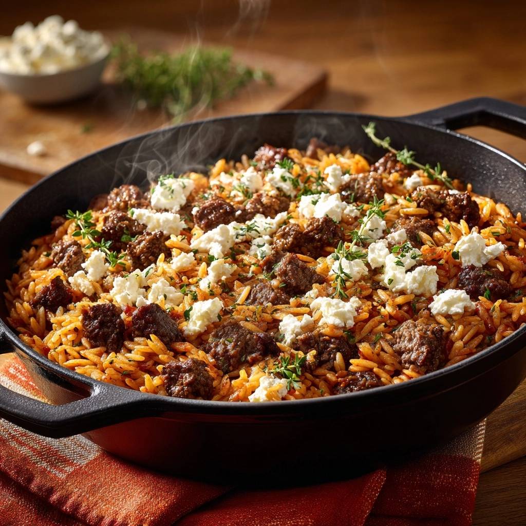 Stell dir vor, du öffnest den Deckel der Pfanne und ein warmer Duft von Thymian und Tomaten umhüllt dich. Der Reis ist fluffig-körnig, die Fleischbällchen saftig und der Feta schmilzt cremig obendrauf. Genau so soll es schmecken!