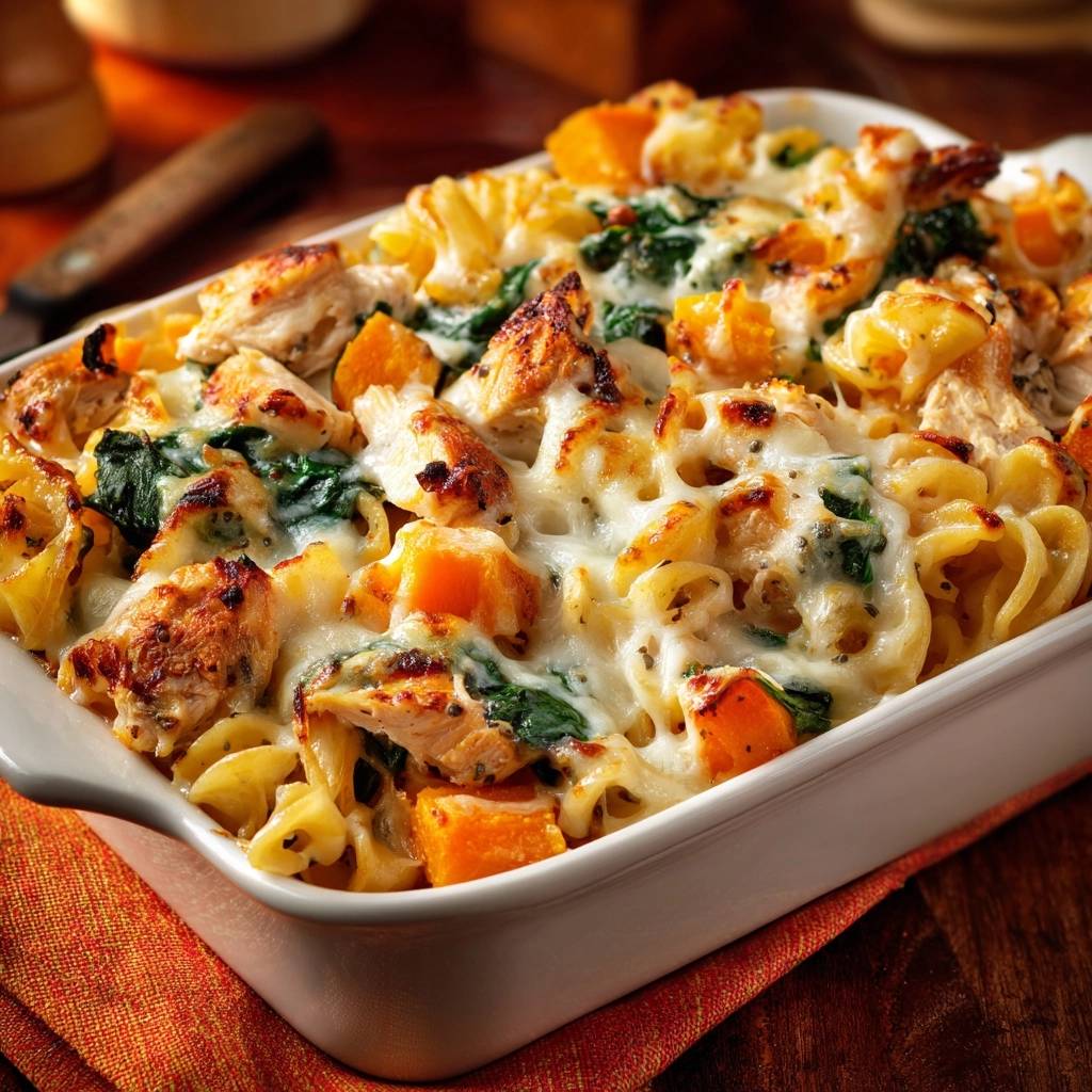 Hähnchen-Kürbis-Spinat-Pasta-Auflauf (Nie wieder trockenes Hähnchen!)
