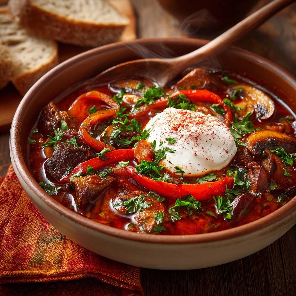 - Vollendung: Gib nach der ersten Garzeit die angebratenen Pilze und die rohen Paprikastreifen zum Fleisch. Lasse alles weitere 20–30 Minuten ohne Deckel sanft köcheln, bis die Sauce die gewünschte Bindung hat und die Paprika weich, aber noch formstabil ist.