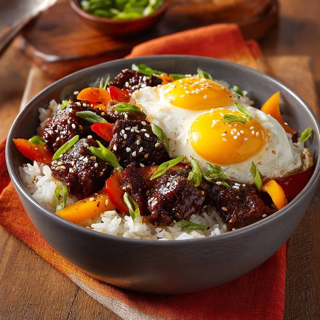 - Anrichten: Verteilen Sie den heißen Reis auf zwei Schüsseln. Geben Sie das dunkel glasierte Rindfleisch-Stir-Fry daneben. Krönen Sie das Gericht mit dem Spiegelei. Mit reichlich Sesam und den schräg geschnittenen Frühlingszwiebeln bestreuen und sofort servieren.