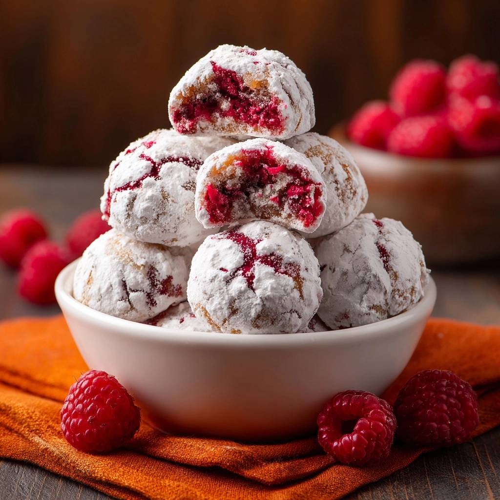 Stell dir vor, du hebst diesen pudrigen Himbeergefüllten Puderzucker-Keks zum Mund. Der erste Biss knackt knusprig durch die dicke Zuckerschicht, und dann explodiert die saftige Himbeerfüllung darin – warm, fruchtig, perfekt gebunden. Kein Tropfen läuft aus, nur purer Genuss.