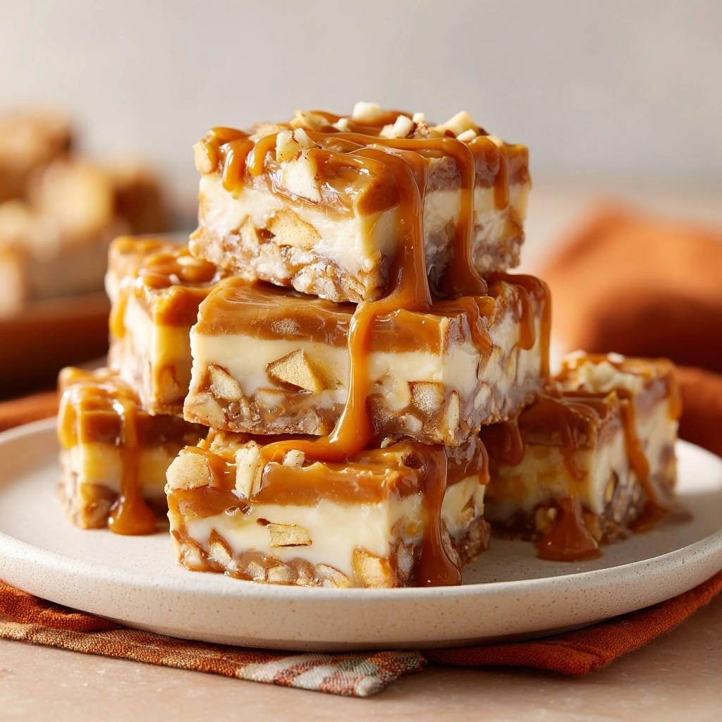 - Verteilt die Karamellsauce großzügig und ansprechend über die gekühlten Schnitten. Bestreut die Oberfläche sofort mit den restlichen gehackten Mandeln oder Haselnüssen.
