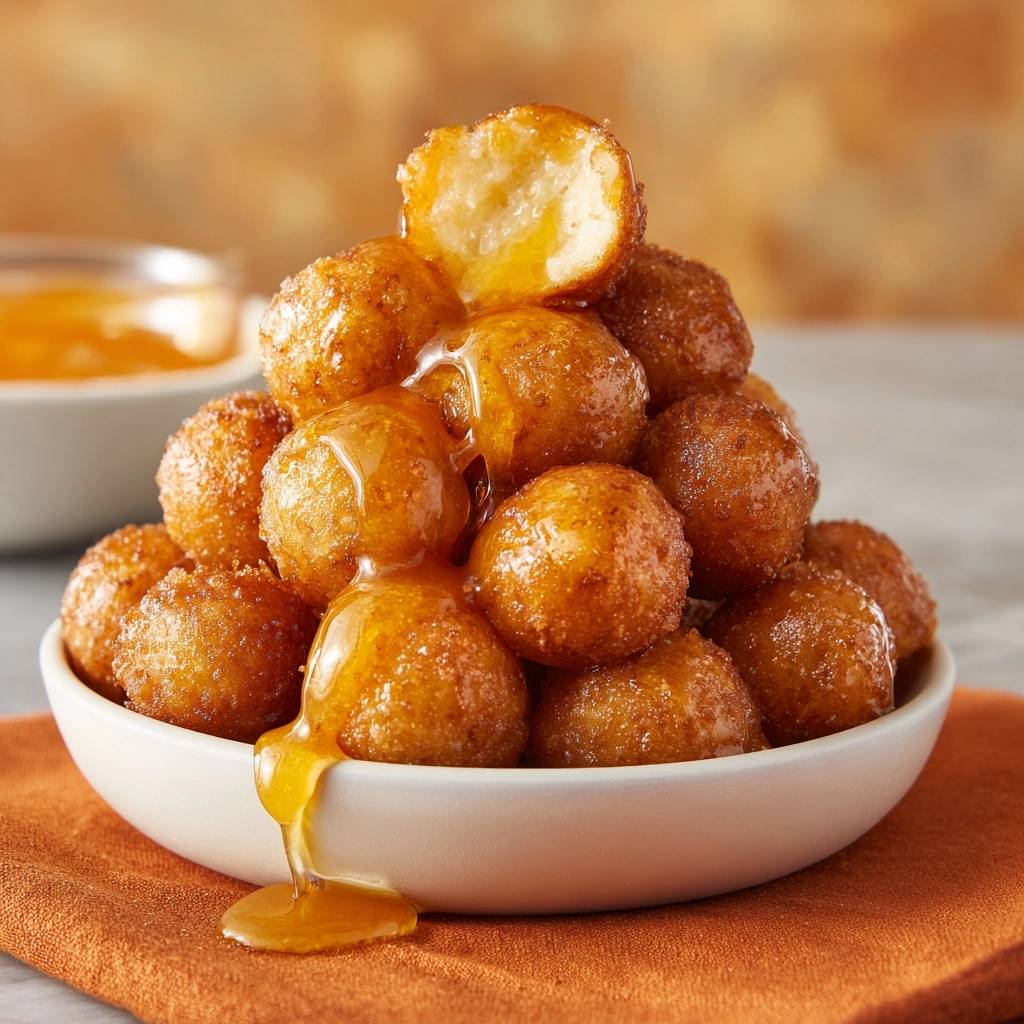 - Butter und Honig in einem Topf bei niedriger Hitze schmelzen, bis eine glänzende Sauce entsteht. Heiße Bällchen damit beträufeln – die doppelt frittierte Kruste saugt keine Feuchtigkeit auf und bleibt knusprig! Sofort servieren. Guten Appetit!