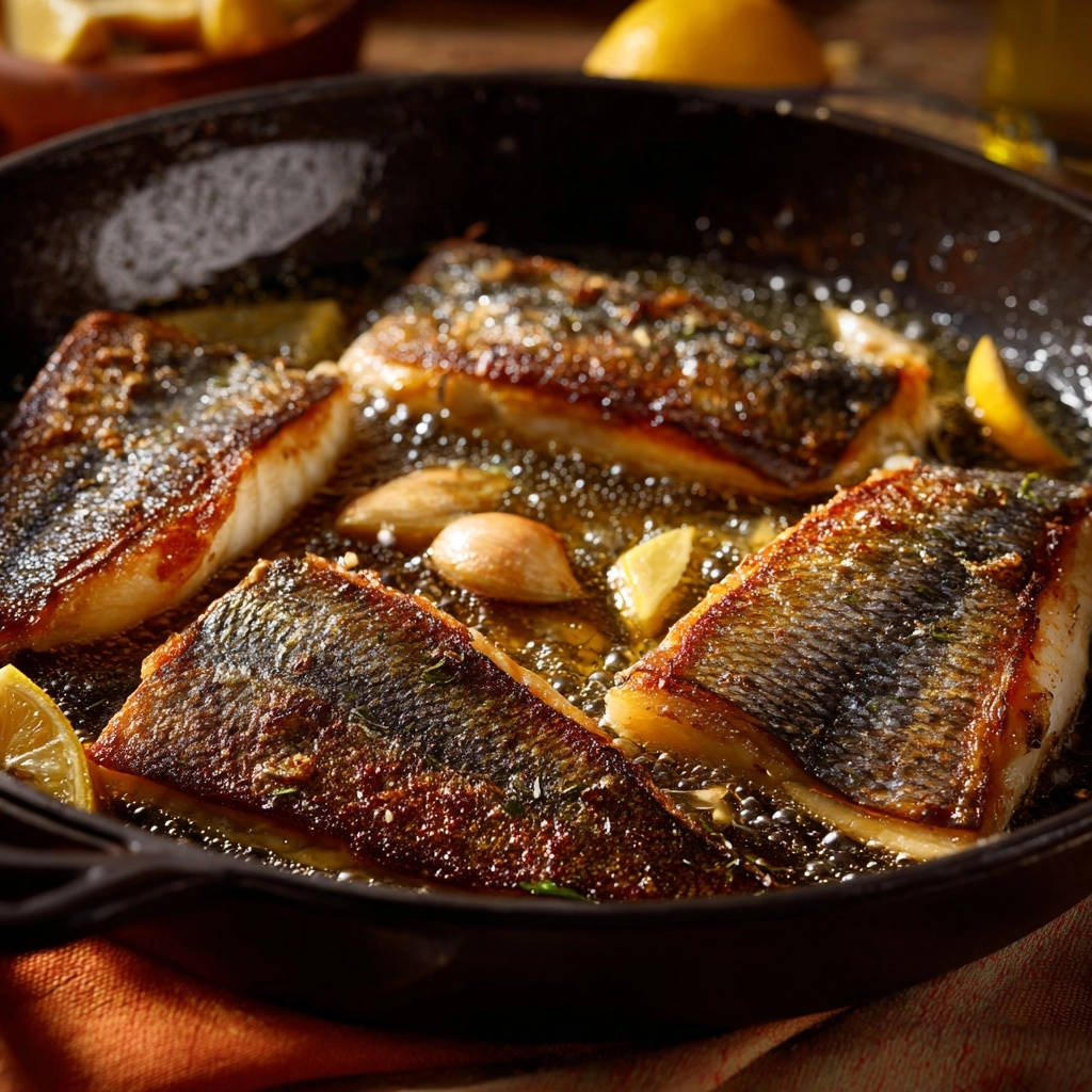 - Genießen: Entnehmt den Fisch aus der Pfanne und lasst ihn kurz ruhen, bevor ihr ihn serviert. Die Zitronen und der Knoblauch aus der Pfanne könnt ihr zum Servieren verwenden, um dem Gericht eine zusätzliche Geschmacksnote zu verleihen. Sofort servieren und die unvergleichlich knusprige Haut genießen!