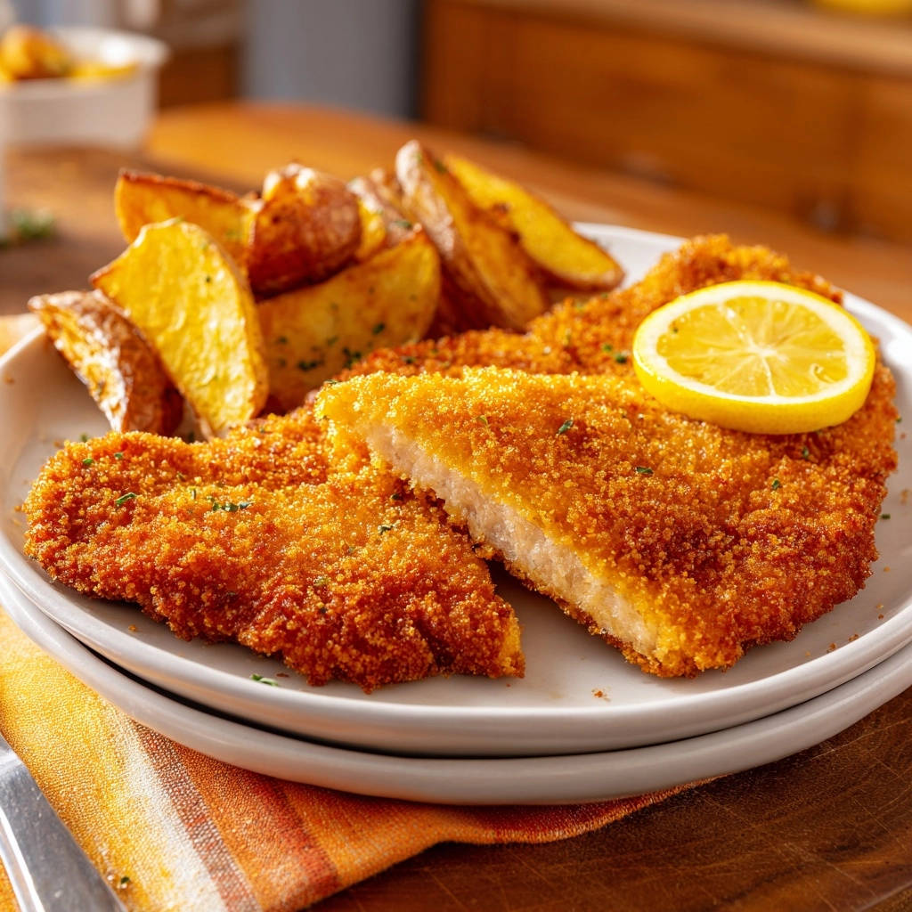 Heute teile ich mit euch das Geheimnis, wie euer Knuspriges Hähnchen-Schnitzel mit Rosmarin-Wedges immer unwiderstehlich knusprig und innen saftig wird, begleitet von aromatischen Wedges, die einfach jeder liebt.