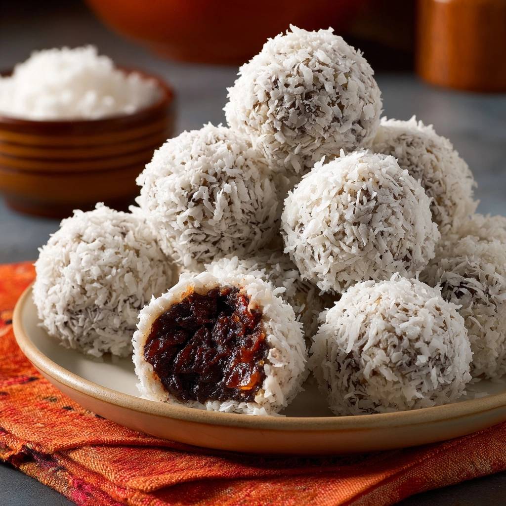 Stell dir vor, du beißt in ein Kokos-Klebreis-Bällchen, und die klebrige Dattel-Füllung explodiert weich und süß im Mund. Der Duft von frischen Kokosraspeln mischt sich mit der natürlichen Karamellnote der Datteln. Diese Bällchen sind pure Freude, fluffig außen, saftig drin.