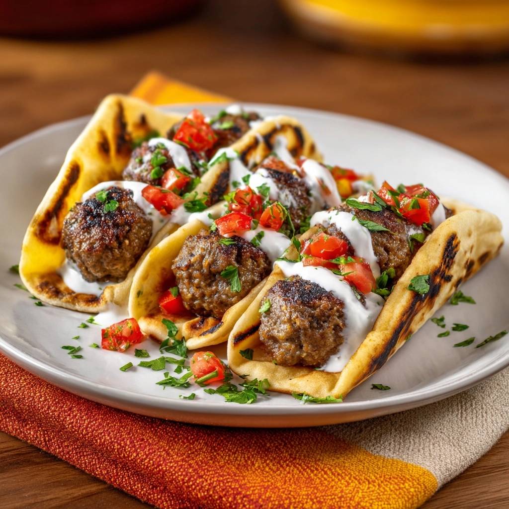 - Anrichten: Legen Sie die warmen Pitas wie Tacos leicht zusammengeklappt auf einen Teller. Geben Sie jeweils drei Fleischbällchen in die Mitte. Träufeln Sie die Joghurt-Sauce großzügig in Linien über das Fleisch (wie auf dem Bild zu sehen). Garnieren Sie das Ganze mit den Tomatenwürfeln und der restlichen Petersilie. Sofort servieren, solange das Fleisch noch dampft.
