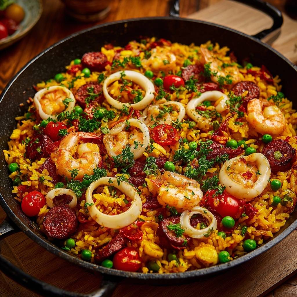 Stell dir vor, du hebst den Deckel der Pfanne, und ein warmer Duft von Safran, Meeresfrüchten und geräuchertem Aroma steigt auf. Der erste Bissen explodiert im Mund: Garnelen so saftig, dass sie platzen, Calamari zart bissfest, Reis locker und aromatisch durchtränkt. Unten knuspert der Socarrat, diese goldene Kruste, die Paella so unwiderstehlich macht.