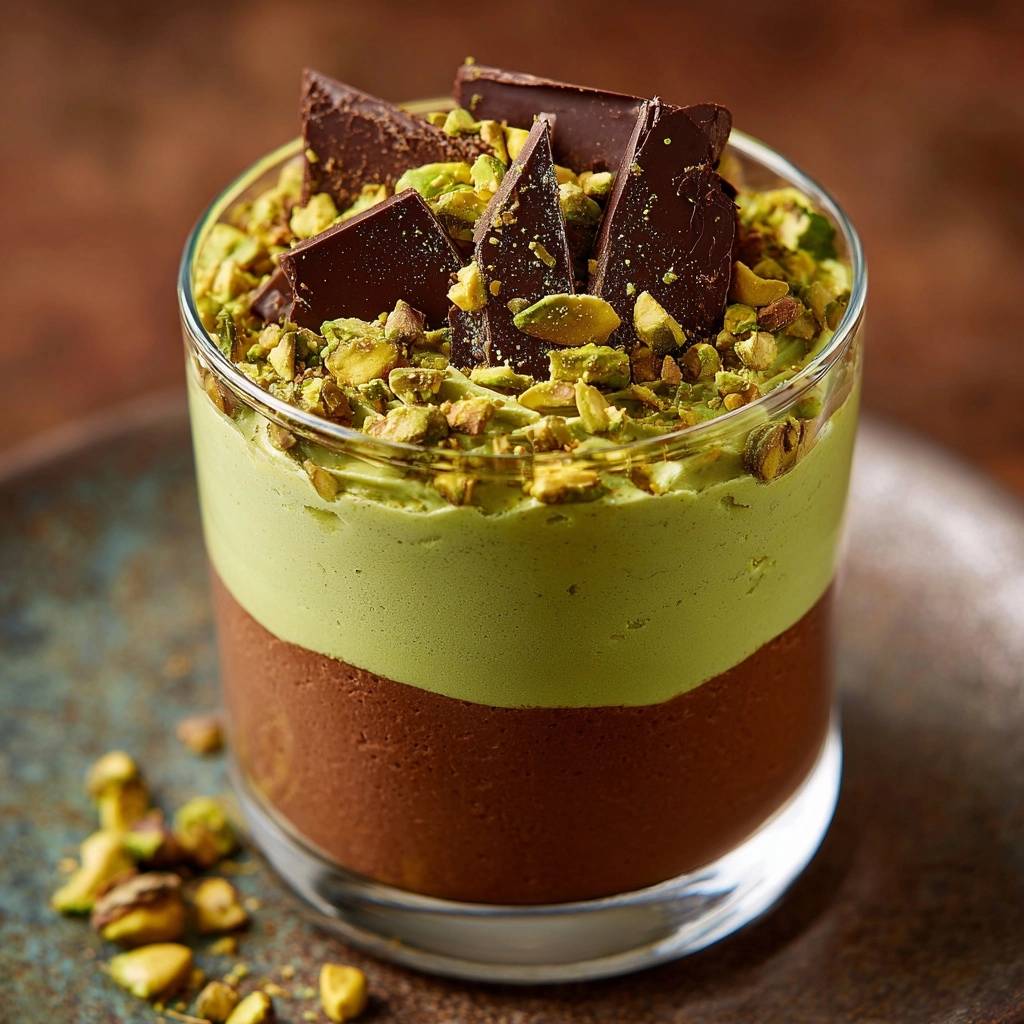 - Vor dem Servieren mit gehackten Pistazien, Schokostücken und ggf. etwas gemahlener Pistazie toppen. Fertig – cremig, layered und fehlerfrei!