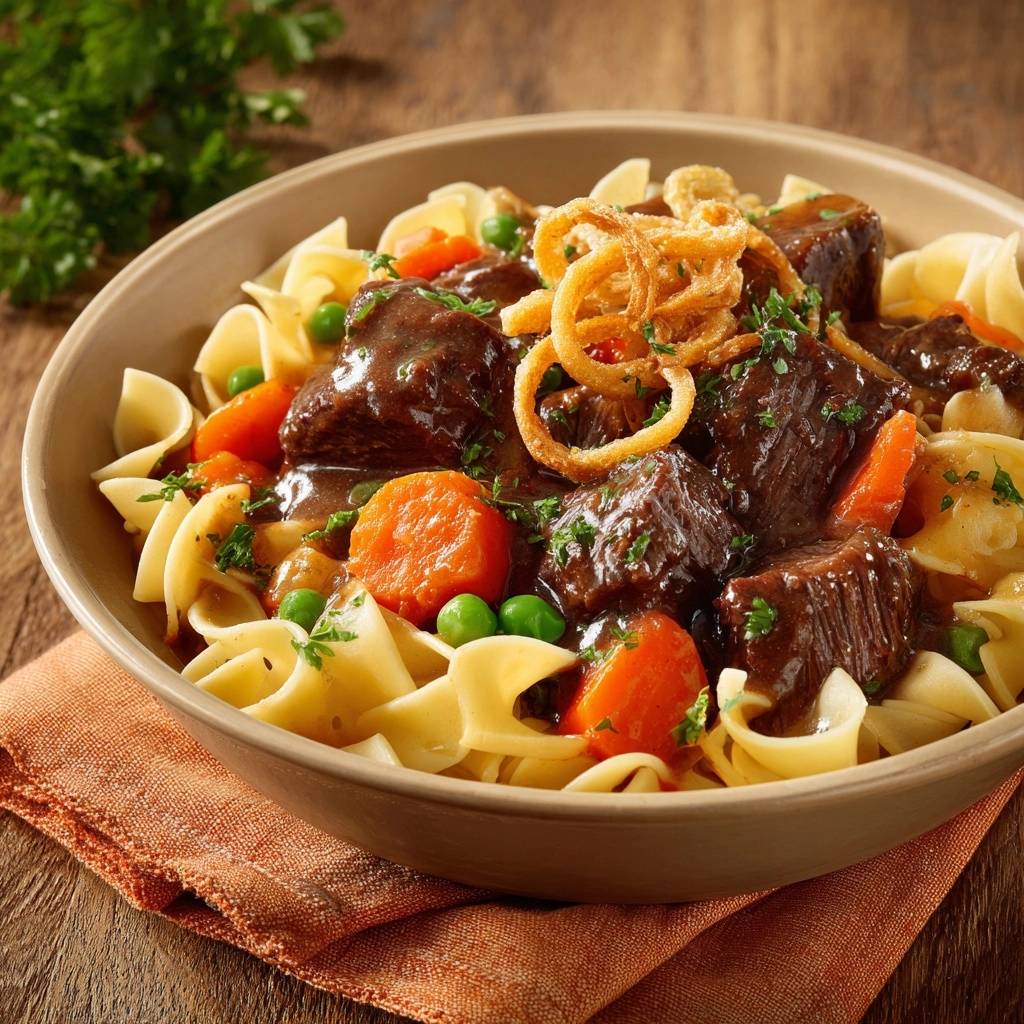 Perfekt für den Alltag. Schnell zubereitet, familientauglich, voller Geschmack. Die Karotten und Erbsen bringen Süße und Biss, Petersilie Frische, knusprige Zwiebelringe Crunch. Du wirst staunen, wie einfach butterzartes Fleisch gelingt. Lass uns loslegen.