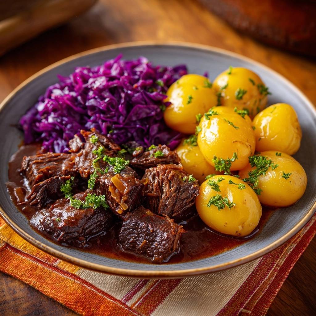 Stell dir vor, du nimmst die erste Gabel dieses Rindergulaschs mit Rotkohl und Petersilienkartoffeln. Das Fleisch schmilzt butterzart auf der Zunge, die Soße umhüllt alles saftig und würzig. Der Duft von geröstetem Paprika und Kümmel zieht durch die Küche, während der Rotkohl knackig daneben leuchtet.