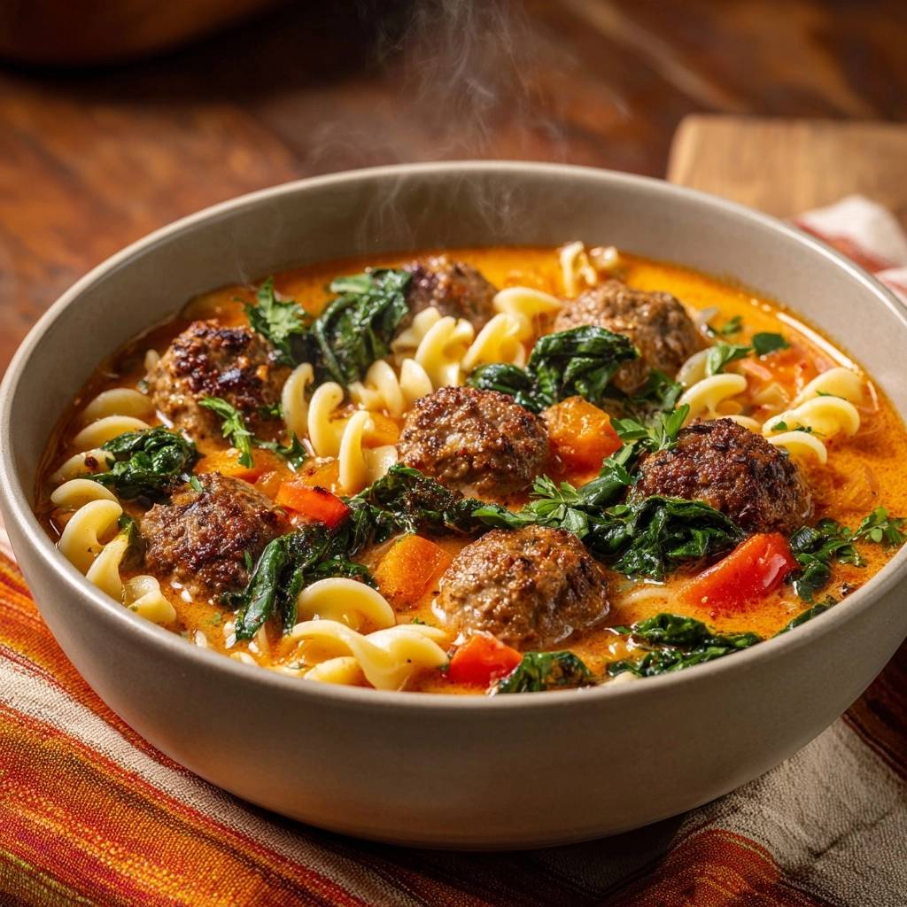 Stell dir vor, du löffelst die erste Portion saftige Fleischbällchen in cremiger Gemüsesuppe mit Fusilli & Spinat. Der Duft von gebratenem Hack, süßem Tomatenmark und frischem Oregano steigt auf, während die knusprigen Bällchen im cremig-orangen Sud schwimmen. Jeder Bissen explodiert mit Saftigkeit, das Gemüse knackt, und die Fusilli? Die bleiben bissfest, kein Matsch weit und breit.
