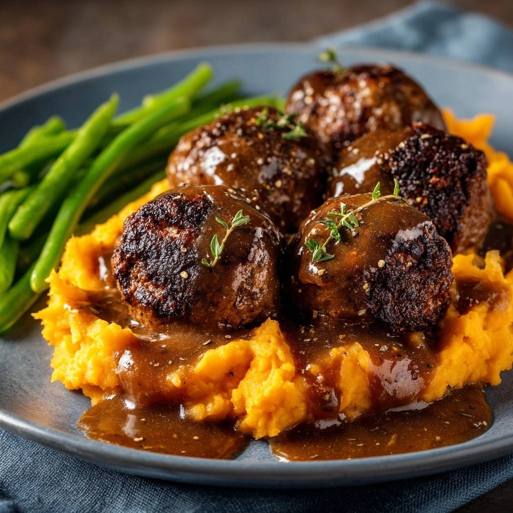 Saftige Rinder-Hackbällchen auf Süßkartoffelpüree