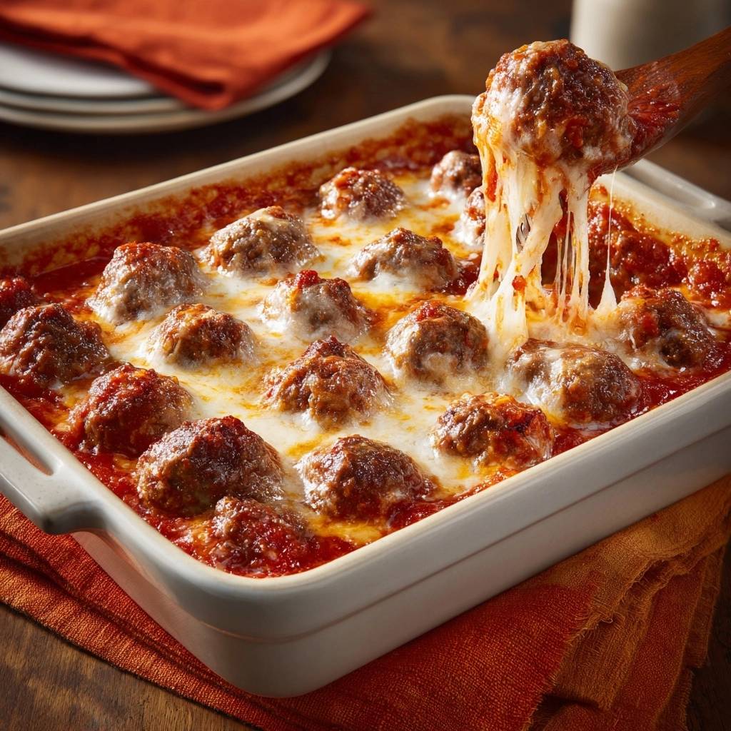 - 20-25 Minuten backen, bis Käse goldbraun schmilzt und Bällchen durch sind. Herausnehmen und 5 Minuten ruhen lassen. Fertig – saftig, käsig, unwiderstehlich!