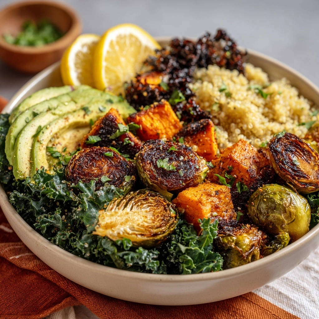 - Anrichten der Bowl: Verteilen Sie den massierten Grünkohl als Basis in zwei Bowls. Geben Sie den zubereiteten Quinoa auf den Grünkohl. Fügen Sie anschließend das goldbraune Ofengemüse hinzu. Legen Sie die Avocadoscheiben daneben und garnieren Sie die Bowls mit frischen Zitronenspalten und gehackten Kräutern. Ein Spritzer frischer Zitronensaft vor dem Servieren rundet den Geschmack perfekt ab.