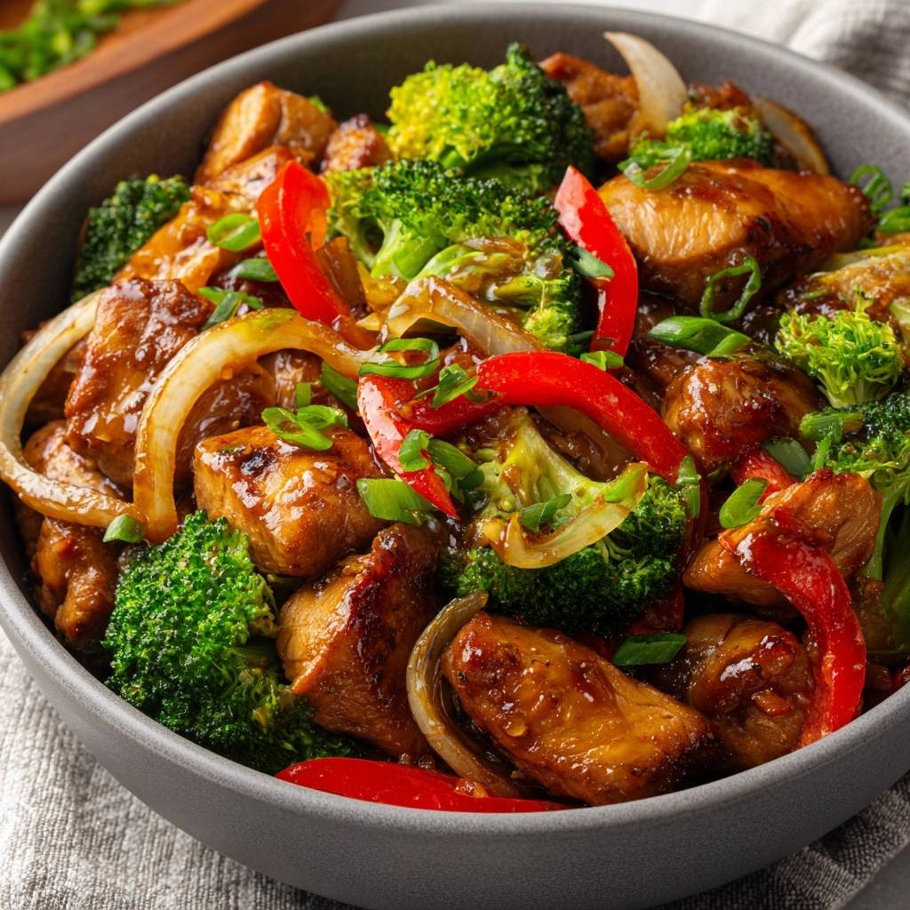 Brokkoli, Paprika, Zwiebeln 3 Minuten rühren, knackig halten. Hähnchen zurück, Soße zugeben. 2 Minuten einkochen, bis glänzend.