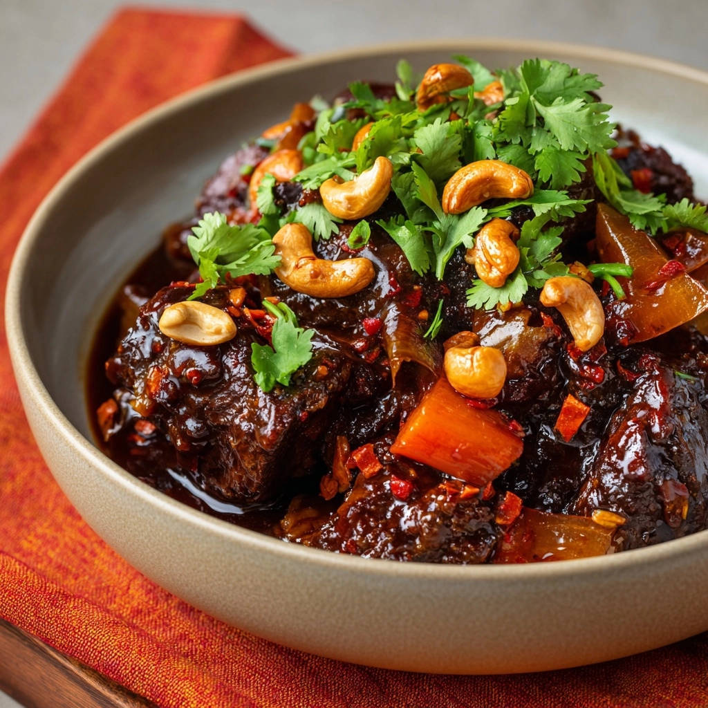 Geröstete Cashewkerne dienen als knusprige Garnitur und bieten einen wunderbaren Texturkontrast zum zarten Fleisch. Frischer Koriander bringt mit seiner zitrusartigen, frischen Note eine angenehme Leichtigkeit und Farbe ins Spiel.
