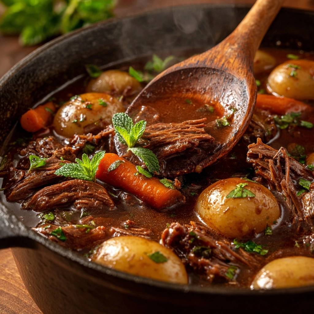 Minzeblätter drüber. Heiß servieren. Fertig ist dein zarter Rindfleisch-Eintopf.