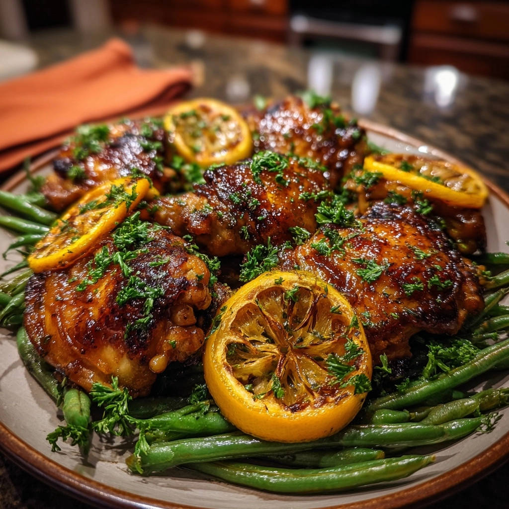 Dieses Rezept für Zitronen-Kräuter-Hähnchenschenkel mit knackigen Bohnen überzeugt durch eine harmonische Mischung aus würzigen, frischen und leicht süßlichen Noten. Die Zitrone schneidet elegant durch die Reichhaltigkeit des Hähnchens, während die Kräuter für eine erdige Tiefe sorgen.